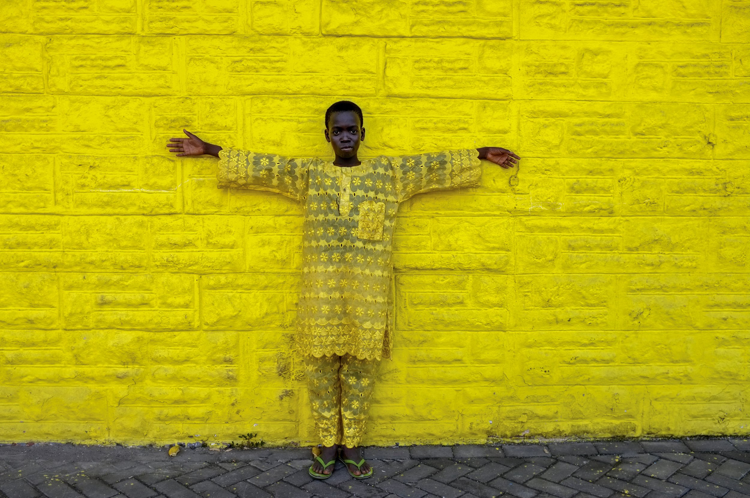 Boy in yellow by a yellow wall. James Town, Accra, Ghana